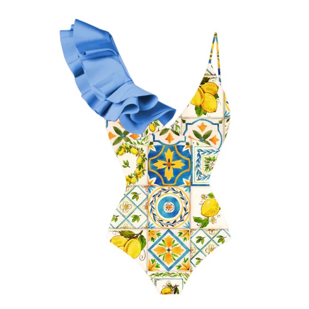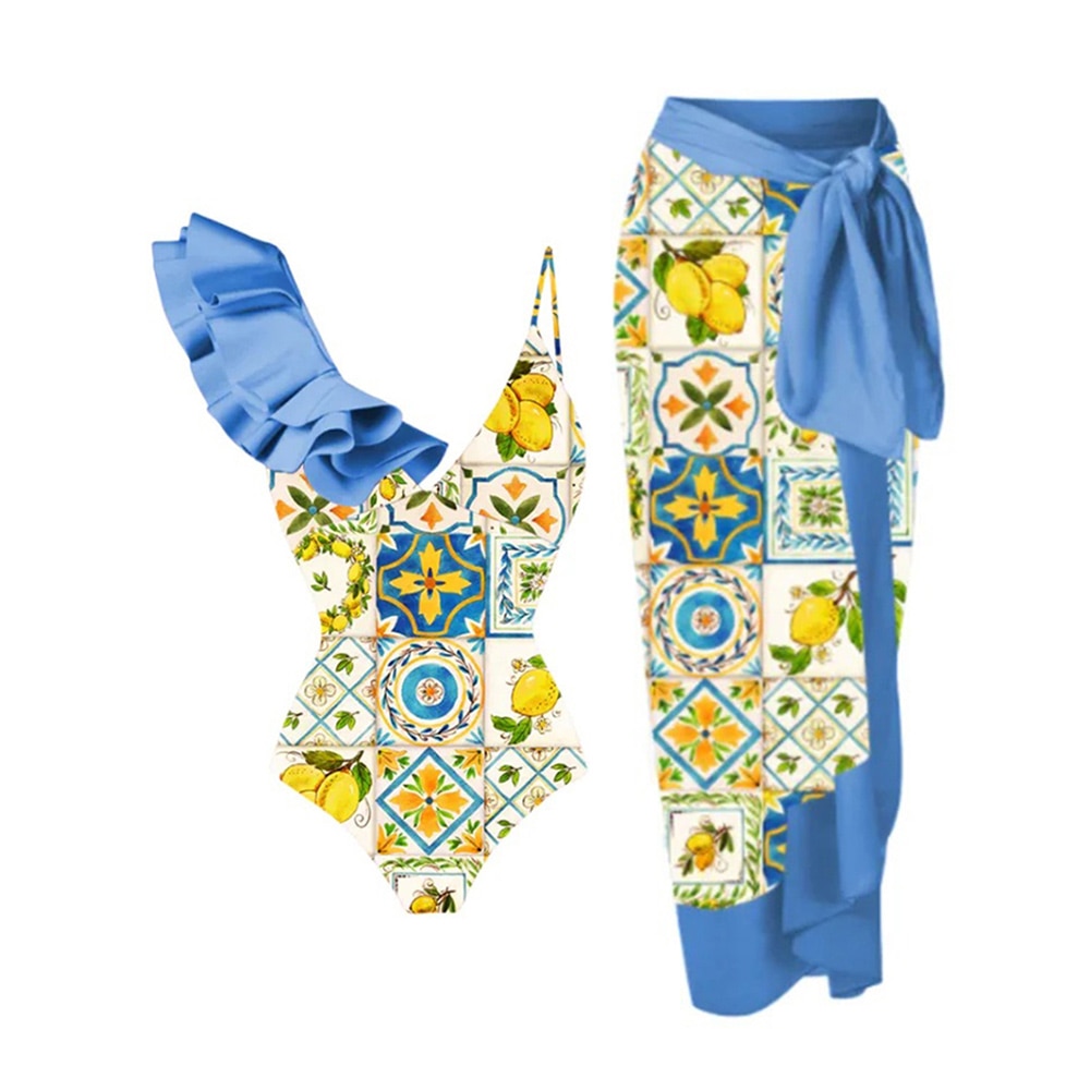 Female Retro Swimsuit & Skirt Asymmetrical Holiday Beach Dress Designer Bathing Suit Vintage Summer Surf Wear