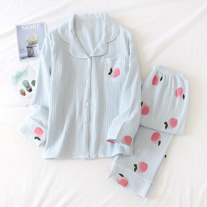 Spring New Ladies Pajamas Set Heart Printed Crepe Cotton Double-layer Gauze Turn-down Collar Long-sleeve Trousers Household Wear